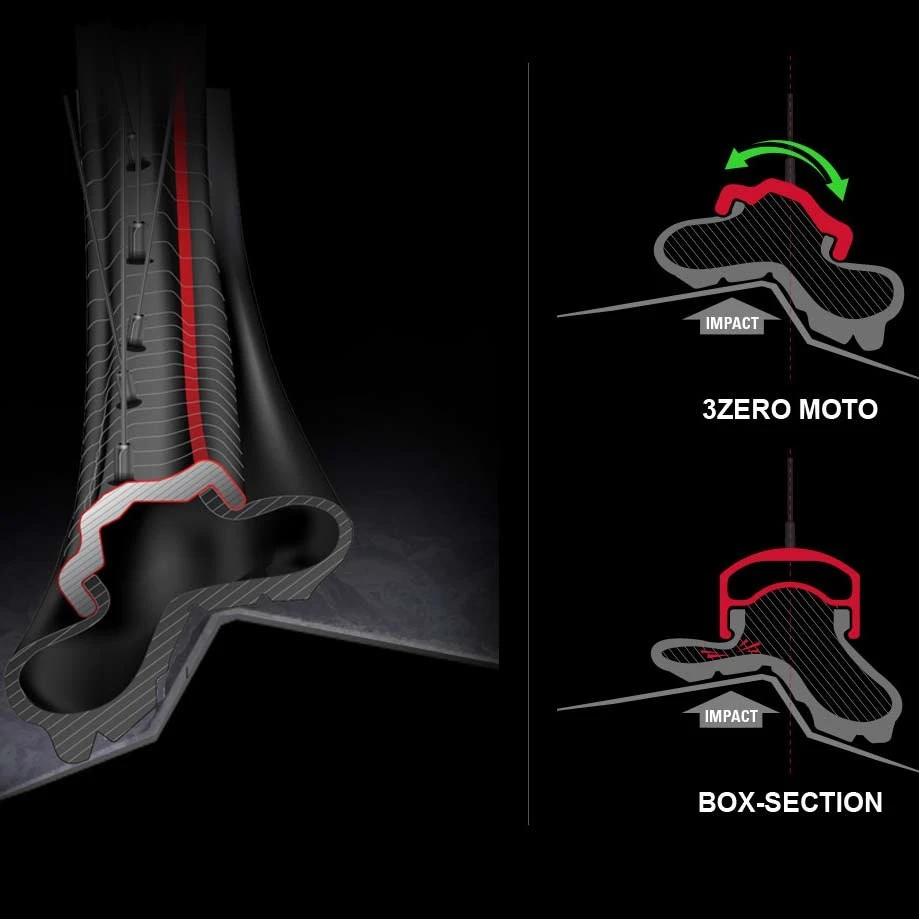 Door de strikte naleving van de MOTO-technologie zijn de verwachtingen inzake slagvastheid van de 3ZERO MOTO-velg overtroffen. In vergelijking met de box-section carbonvelgen van andere fabrikanten heeft de 3ZERO MOTO een grotere buigcapaciteit, wat zich vertaalt in een aanzienlijk hogere rijkwaliteit. Deze voorziening werkt als een extra ophanging, maar de botsenergie wordt gewoon over een groter oppervlak verdeeld. Het risico van een lekke band door verbrijzeling van de velg is dus minimaal.